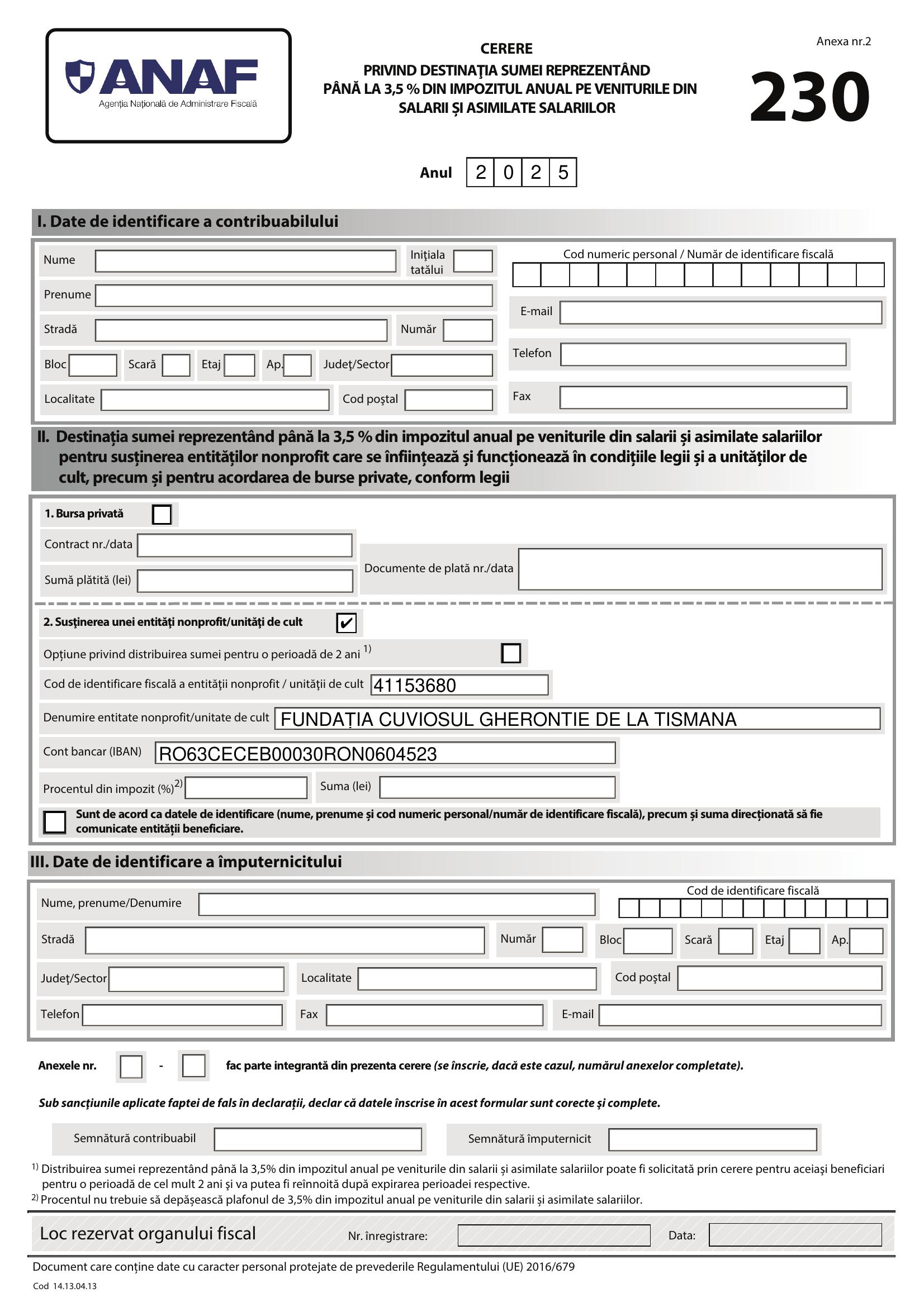 Completați formularul 230 dacă în anul 2025 ați fost angajat sau pensionar. Prin completarea formularului, solicitați statului român să redirecționeze către FUNDATIA CUVIOSUL GHERONTIE DE LA TISMANA 3.5% din impozitul pe venit pe care l-ați plătit deja. Termenul limită pentru completare este 25 mai 2026.